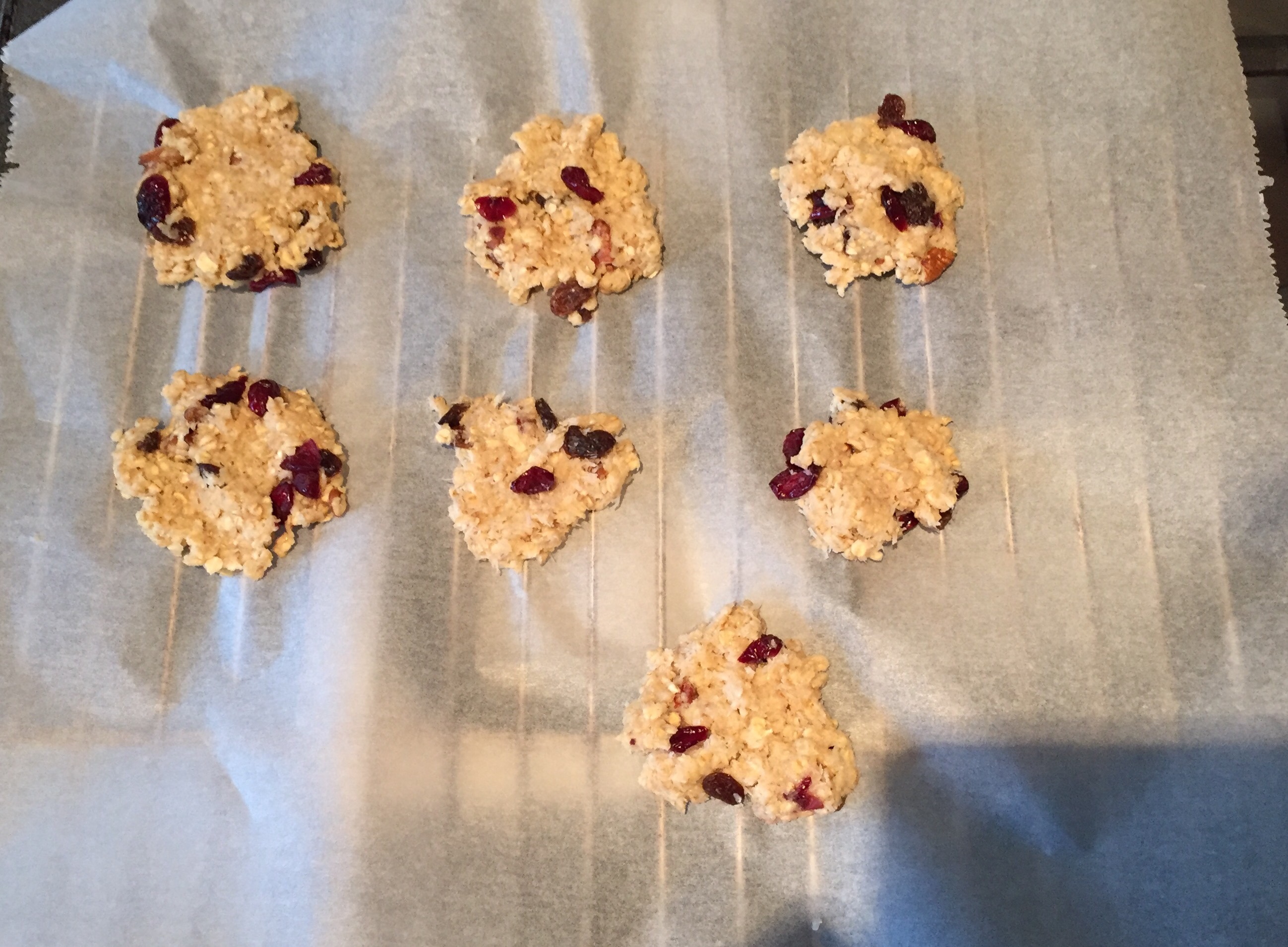 - Roer het geheel door elkaar, voeg nu de rozijnen, cranberry’s en ahornsiroop toe en roer nogmaals goed door elkaar. (Indien je ook stukjes chocola wil toevoegen moet het koekbeslag wel afgekoeld zijn.)